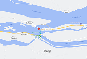 The River Cauvery flows towards the Kallanai Dam, which was constructed by King Karigalan. At this point, the river splits into four branches known as Unara (Kolitam), Kaveri, Vennar, and Pudu River.